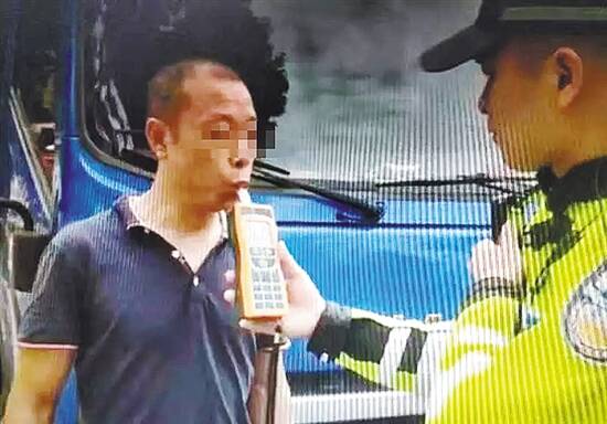 交警正在对货车驾驶员段某进行酒精呼气检测 |