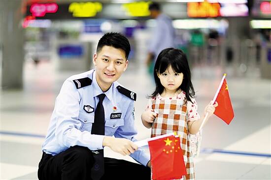 边检民警与旅客手持国旗迎国庆 丁瑞 摄 |
