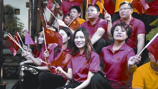 龙岗区吉华街道办党工委书记龙云、吉华街道办事处副主任何世强、吉华街道商会会长周南等出席活动,商会副会长单位企业家代表、学校学生、企业员工等近300人共同挥舞着鲜艳的五星红旗,满怀深情地唱出“我和我的祖国,一刻也不能分割,无论我走到哪里,都流出一首赞歌……”共同高呼喊出“我爱你中国”。 当青春快闪“遇见”客家古镇。熟悉的旋律在历史文化底蕴深厚的客家小镇响起。活动现场,在领唱者的带领下,热烈的氛围、蓬勃的能量迅速在甘坑客家小镇景区内蔓延开来,全场几百人饱含深情唱出对祖国的赞歌,大街小巷每个人挥舞着手中的五星红旗,广场瞬间变成红色海洋。高潮环节,还摆出了“70”的人形字样,无人机从空中航拍,以创意新潮的方式表达吉华街道人民团结一致、拼搏奋进的决心和意愿,抒发对伟大祖国的无比崇敬和热爱之情。 (蔡鹏飞 姚贤康)