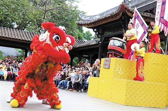 祖庙里的舞狮表演,吸引众多游客观赏 |