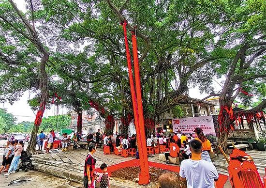 何谓国树榕?据了解,烟桥村国树榕是由一棵1945年种下的大榕树向周边延伸的子树,由于村民有意识的规划,每一棵子树都是在一件国家大事发生时引种。烟桥村国树榕现有子树9棵,分别在日本投降、新中国成立、改革开放、香港回归、澳门回归、庆祝中国共产党成立90周年等时间点上种植。国树榕是烟桥先人智慧的体现,也是烟桥人爱国主义精神的见证和传承。如今,这棵百年古榕覆盖面积已有几百平方米,古榕下是青石地面、青石台凳,已成为村民休闲、聊天、乘凉、聚会的好地方。 10月7日,为庆祝中华人民共和国成立70周年,烟桥村第十棵“国树榕”举办种植动土仪式。据烟桥经济社社长何暖兴表示,烟桥村人以独特的仪式庆祝国庆,将国树榕的须根引种到地上生成一棵新的树,引种的新树,是第十棵,代表着“十全十美”。“今天的仪式不但是为了庆祝新中国成立70周年,同时也是为了纪念烟桥村70年来不变的爱国情义、淳朴乡风,以及70年来的发展。” 据了解,近年来,烟桥村通过古村活化和乡村振兴,在“五大振兴”任务中建设卓有成效。该村古村活化已累计投入1000万元资金,24个项目,先后复建和修缮了兰桂芳、旗杆夹石、名人馆、村史馆、游客服务中心、读书驿站、停车场等,更编写了《烟桥史话》。同时,村里通过展示家风家训,当代先进人物事迹,举办正道成人礼等活动,将正道文化,龙舟文化和孝德文化发扬光大,成效显著。