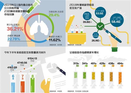 日前,国家药监局还起草了《药品注册管理办法(修订草案征求意见稿)》。意见稿指出,包括临床急需的短缺药、儿童用药、罕见病用药、重大传染病用药、疾病防控急需疫苗和创新疫苗等均被纳入加快上市注册范围。这也意味着,政策层面将持续为创新疫苗的研发生产“开绿灯”。 实际上,自去年下半年以来,受疫苗行业“黑天鹅”事件的影响,疫苗行业发展整体放缓,疫苗行业整体批签发数量下滑较为明显。2012-2017年年均批签发量为6.4亿支,2018年国内疫苗批签发约为5.4亿支,低于历史平均水平。今年上半年,疫苗批签发为2.2亿支,略低于去年同期。 不过,进入下半年,疫苗行业正逐渐走出低谷,批签发速度回暖,其中,6月中检所共完成预防用生物制品批签发4162.09万份,保持逐月小幅增加态势;7月中检所共完成预防用生物制品批签发4740.56万份,继续回暖。8月新增疫苗批签发6154.13万支。 东吴证券认为,《疫苗法》的出台将使得批签发进度有望加快。考虑去年下半年疫苗行业销售的低基数,今年下半年疫苗行业有望实现高增长。 安信证券认为,目前我国国产创新多联多价疫苗品种相对稀缺,与国外差距明显,但在国家政策支持下,13价肺炎疫苗、HPV疫苗、多联苗等创新品种有望加速上市。