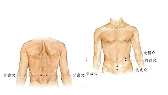 大横穴:位于腹部,肚脐旁开4寸(5横指)处,左右各一。