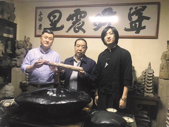 李闻海(左)、李秋乐(右)父子推广尺八艺术,得到著名作家贾平凹的支持 |