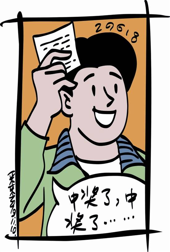 插图 采采 邓文说:“有多大脚,穿多大鞋。借钱买房不是个事儿,等有钱再买吧。至于阿远爱买彩票,谁没点爱好呢?再说了,他买彩票,总比抽烟打牌好。说不定还真能中大奖呢。” 小吴笑着说:“说得也是,阿远不抽烟、不打牌,就喜欢买点彩票,也算不错了。”阿远傍晚回来的时候,邓文将小吴让他们借钱买房的事说给阿远听。阿远沉思了一会儿,说:“还是等我中奖了再买房吧。”邓文笑笑,没再继续这个话题。 晚上9点,邓文整理了一天,有些累,早早休息去了。阿远则坐在电视机前收看彩票开奖直播。半梦半醒中,邓文听到客厅传来一声惊呼,然后看到阿远急匆匆跑进来,一脸兴奋地说:“中奖了,中奖了,我这次中大奖了!”“二等奖!”阿远喘口气,加重语气,三个字说得掷地有声。 邓文猛地坐起来,问:“真的?!”阿远郑重地说:“当然。”邓文的心狂跳起来,激动地问:“你买了几注?”阿远乐呵呵地说:“你还不知道我的习惯?每次选5组号码,每个号码买2注。” 邓文开心地说:“你的意思是,我们有钱买房了?”“那当然。”阿远说:“行行出状元,我说过的,只要我用心研究彩票,就一定能让你住上属于自己的房子。”“你呀,就吹吧。”邓文笑着用食指轻点了一下阿远的胸口,满心欢喜。(熊燕)