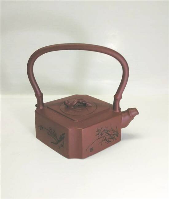 图中的棱形紫砂提梁壶,显浅紫色,名为《梅兰竹菊》(正高级工艺美术师刘文的作品),采用泥片镶接法成形,棱形的四面匀挺柔和,壶身饱满圆润,提梁弯曲自然,线与形结合适到好处。
