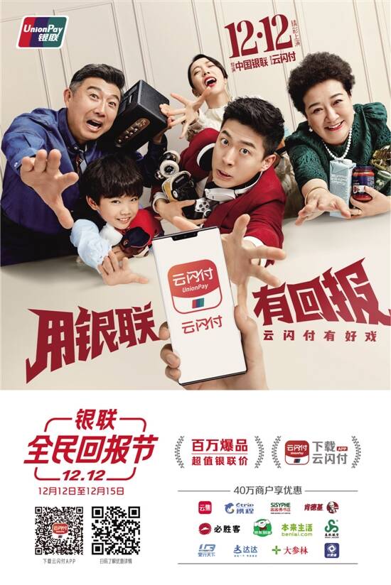 近日,正值云闪付APP7.0版本全新发布之际,中国银联宣布全民回报节将于12月12日正式启动。本次全民回报节将从12月12日至12月15日,在此期间,消费者可使用云闪付APP、银联二维码、银联手机闪付等银联移动支付产品,在超过40万家线下商户门店以超值优惠价格(部分低至原价1折以下)购买百万爆款商品。境外商户也将参与12.12全民回报节,为消费者带来诸多惊喜。
