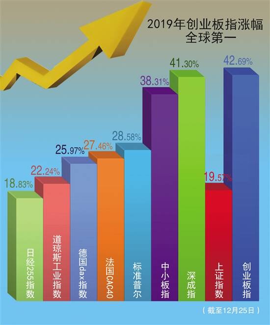 策划统筹:李卉 2019年即将挥手离去,2020年招手而来。2019年的财经大事即将装订成册,辞旧迎新之际,羊城晚报记者尝试用123456串起一年的财经风云,同时管窥未来。回顾过往是为了更好地走向未来,开往2020年的发动机即将启动,一路前行,未来可期,让我们一起迎接新年新“钱景”。 A股创业板指涨幅全球第1 今年大涨超四成 羊城晚报记者 戴曼曼 今年领涨了!曾经压抑的A股今年扬眉吐气大翻身。羊城晚报记者对比今年全球主要股指表现发现,截至12月25日,创业板收于1784.39点,今年以来累计涨幅达到42.69%,成为全球主要股票市场指数中的涨幅冠军。 据不完全统计,今年同期,全球主要市场指数涨幅大部分在20%-30%之间,截至12月25日16:00,道琼斯工业指数涨幅为22.24%,标准普尔涨幅为28.58%,德国dax指数涨幅为25.97%,日经255指数涨幅为18.83%,法国CAC40涨幅为27.46%,均低于创业板指数涨幅。 记者注意到,除了创业板指领跑全球主要股指之外,A股其他指数2019年的表现也相当不错:截至12月25日,上证指数涨幅为19.57%,深成指涨幅为41.30%,中小板指涨幅为38.31%。 业绩的改善是支撑创业板今年跑赢全球的基础。当前科技创新潮流下,创业板集中了不少各类科技公司,表现亮眼并不令人意外。数据显示,前三季度创业板公司业绩持续改善,平均每家公司实现营业收入13.80亿元、营业利润1.47亿元,同比分别增长10.01%、9.76%。 创业板改革预期的不断强化也是重要原因。就在12月22日,《中共中央 国务院关于营造更好发展环境 支持民营企业改革发展的意见》印发,意见指出,鼓励符合条件的民营企业在科创板上市。深化创业板、新三板改革,服务民营企业持续发展。 作为继科创板后下一个注册改革的领头兵,如何把握创业板改革带来的政策红利,可以作为明年投资者重点关注的方向。 创业板年内的表现只是A股今年市场的一个“缩影”,A股市场也成为近年来全球表现最好的一个资本市场。前海开源基金董事总经理杨德龙就断言,未来十年将是我国资本市场大发展的十年,A股市场将迎来“黄金十年”的机会。 年末,作为投资者的根本大法,证券法修订草案迎来四审,业内人士认为,证券法修订将优化制度供给,进一步明确资本市场改革发展方向。