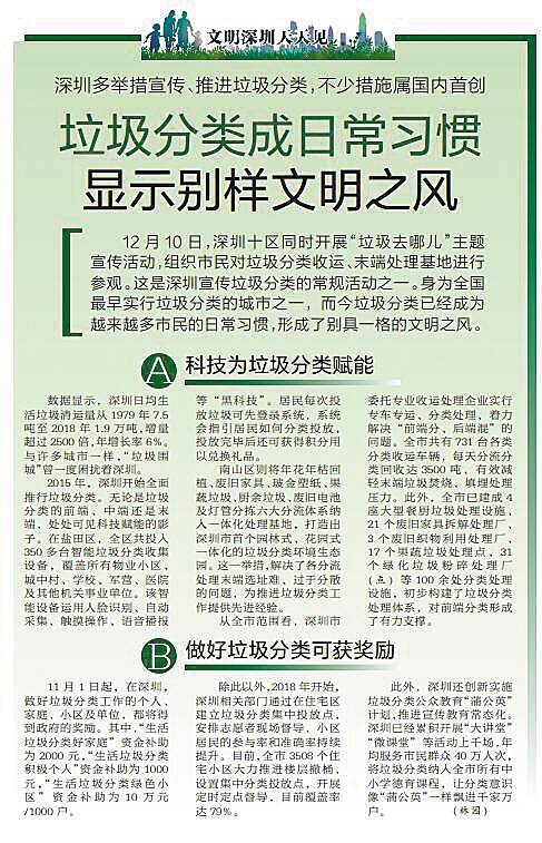 “一套好的机制,胜过千万次的突击式治理。”在分享深圳文明创建的探索和举措时,深圳市委常委、宣传部部长李小甘曾如此总结。多年来,深圳坚持整改薄弱环节,完善长效机制,真正把文明城市创建工作做到重在日常、抓好经常、融入平常。 文明渗入各个领域 文明的范畴是宽泛的,交通文明、生态文明、行为文明……在深圳,文明已经渗入各个领域,成为市民生活中的一部分。 作为拥有千万流动人口的城市,深圳四通八达的交通网络,见证着这座城市的生生不息。交通是一座城市的命脉,更是观察一座城市文明程度的流动窗口。有序的交通环境离不开人们文明交通的观念和习惯,深圳交通文明背后是深圳整体高水平的道德素养和文明程度。机动车礼让行人、行人不闯红灯、社会车辆给救护车让道……这些交通文明在深圳早已蔚然成风。而细究其原因,顶层设计在细节处也不松懈,不论是机制保障还是科技助力,都有章可循。比如,目前,深圳行人闯红灯分档处罚对违法行人最高处100元罚款,是全国行人闯红灯违法处罚额度最高的城市。深圳还计划在每个区增加1-2套人脸识别抓拍设备,依靠科技手段,提高重点查处行人、非机动车违法的查处率。 身为空气质量最好的一线城市,深圳在生态文明建设方面同样有许多可圈可点的地方。深圳积极探索运用科技手段和市场手段创新生态环境管理制度,提高生态环境监管质量和效率。其中,2015年,深圳以大鹏新区为试点在全国率先启动自然资源资产负债表编制工作,对新区林地、城市绿地、湿地、饮用水、景观水、沙滩、近岸海域、大气等10类自然资源资产实物量价值和生态系统服务价值进行了核算。在试点经验基础上,形成《深圳市自然资源资产负债表编制技术规范》。这一摸清生态“家底”的举措,既为政绩评价和开展生态补偿提供基础数据,又为“生态审计”和环境监管提供依据。 文化发展滋养文明 深圳的这朵文明之花,得益于文化的滋养,还将越来越艳。 加强公共文化服务体系建设,促进公共文化发展,是丰富人民群众精神文化生活、建设高水平城市文明的必然要求。硬件方面,近几年,深圳不断创新做法、完善机制,为市民畅享美好文化生活提供有力保障。目前全市共有公共图书馆650家,各类自助图书馆设施296台,“一区一书城,一街道一书吧”的布局持续推进。此外,“新十大文化设施”“特色文化街区”名单出炉,深圳歌剧院、中国国家博物馆·深圳馆等51个大型文体设施将陆续建设。软件方面,深圳“城市文化菜单”丰盛有味:“国际水墨画双年展”“国际版画双年展”“深港城市/建筑双城双年展”“一带一路”音乐季……2019年,深圳城市文化菜单共收录国际化、标志性品牌文化活动34项,新增11个品牌项目,涵盖文化艺术、创意设计、科技创新、体育休闲等多个类别,让广大市民充分享受到“月月有主题,全年都精彩”的丰富文化生活。 而今的深圳,取得了文明城市五连冠等优异成绩,培育了全民阅读、全民公益、志愿服务等文明风尚。深圳还将向着建设区域文化中心城市与彰显国家文化软实力的现代文明之城的目标,坚定前行。 文明深圳天天见相关报道 全国率先立法促进文明 2013年3月1日,《深圳经济特区文明行为促进条例》(以下简称《文明条例》)施行。这是国内首部文明行为促进条例。在此之前,深圳市人大常委会针对“何种不文明行为应进行处罚”、“不文明行为违法应如何处罚”以及“对不文明行为执法权”等与市民息息相关的问题进行了3轮民意调查。此前,各地对于市民的文明行为大多以倡导或者树立标准为主。对此,也有不少人困惑:立法能解决文明问题、罚款就能促进文明吗? 实践证明,深圳走出了一条特有的以法治促进文明之路。《文明条例》实施六年来,深圳市民的文明素养和精神面貌焕然一新,无偿献血、自觉排队、礼让行人、公共场所不吸烟、不乱丢吐等文明行为已成为城市的靓丽风景。并且,《文明条例》还将不断完善。比如,在《文明条例》颁布实施后,在城市文明建设中进行了许多探索创新,并取得了显著成效。许多创新做法,例如对新入户市民进行文明教育、对大型集会活动要求文明保障等创新,相关部门将通过地方性法规加以法制化。 随着经济社会的发展,新情况新问题不断产生,有些新的不文明行为当前还缺乏相应的规制。例如当前比较流行的“共享单车”“无人机”等问题,虽然政府主管部门不时针对有关乱象作出一些规定,但缺乏相应的综合的具有全面指导意义的规范。此外还有网络游戏、网络言论等类似问题,《文明条例》均计划将其纳入规范。 值得一提的是,《文明条例》的修改稿还提出,社会服务可折抵罚款金额,“因违法的不文明行为受到罚款处罚的,可以申请参加有关行政执法部门安排的社会服务。参加社会服务的,可以折抵相应的罚款处罚。”