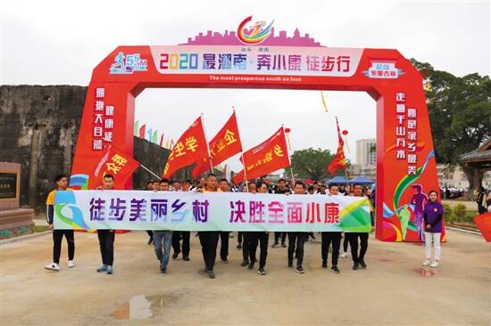 羊城晚报记者当天在现场采访时看到,此次徒步活动由潮南区创文办、区总工会、区文化广电旅游体育局联合举办。当地各级党政机关、市民群众、中小学生、企业代表等组成的徒步方阵队伍共有近千人。 当天上午9时30分许,活动在“奋进新潮南”的精彩武术表演和欢快热烈的音乐声中开幕。而在潮南区领导为各个徒步方阵授旗后,参与活动的不同方阵的徒步爱好者们高喊着“高效潮南 齐奔小康”、“振兴潮南 教育先行”、“美丽乡村 活力潮南”、“乡村振兴走新路 逐梦小康当先锋”等口号,有序出发。 据悉,潮南徒步节活动开展至今已有4个年头,每年都安排不同的路线、不同的主题,吸引了众多市民群众积极参与,品牌活动效应及社会影响力也在逐年增长。 “潮南区委、区政府以创文强管为总抓手,牢固树立‘绿水青山就是金山银山’的理念,全力抓好新农村连片示范区建设和加快乡村振兴发展”,潮南区委常委、宣传部部长黄丽凤告诉记者,近年来该区的城乡环境有了很大的提升,取得了明显的成效,而“最潮南·奔小康”徒步行活动的初心和使命,就是让广大干部群众共沐在新时代的阳光下,感受乡村振兴带来的喜人变化,团结动员全民投身创建全国文明城市和新农村建设,为全面建成小康社会谋好局、起好步。 据悉,此次徒步活动的路线贯穿潮南区省级(第三批)新农村连片示范建设工程示范片五个主体村。这是近年来潮南区全面深入贯彻落实中央、省和汕头市的有关决策部署,围绕“潮音侨韵,风尚家园”的主题,积极创建的省级(第三批)新农村连片示范建设工程示范片,全面展示了潮南区新农村产业兴旺、生态宜居、乡风文明、治理有效的乡村振兴样板。 值得一提的是,潮南区今年的徒步行还富有趣味,沿途增设了文化旅游推介、潮南“非遗”展示、特色美食品尝、现场助兴节目、打卡拍照标语等,吸引了众多徒步爱好者驻足欣赏品尝。