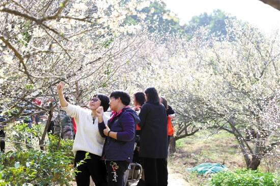 据悉,汤溪镇是饶平当地有名的赏梅胜地,而该镇的居豪村每当梅花怒放时,一树树雪白的梅花铺满了整个山头,疏影横斜,暗香浮动,总能吸引到不少游客和摄影爱好者前来观赏,并“刷爆”当地许多市民的微信朋友圈。 本月5日恰逢周末,选择到居豪村赏梅的市民游客很多。“路边不能停车,往前走几百米就有停车场,前面的梅花更加漂亮。”当天,在山路旁,一位身穿黄色马甲的工作人员笑着迎上一辆车,为游客指引疏导交通,他是居豪村村委主会任吕春德。 据吕春德介绍,居豪村种植了5000多亩青梅,每年花开时节都吸引了大批游人前来,去年还引起了大塞车。为此,今年村里早早就提前部署,不仅每天组织人员疏导交通,还开放学校、村委会、广场等场地供游客免费停车。 吕春德说,青梅跟橄榄是居豪村的主要收入来源,梅花观赏期间可以带动村民农副产品销售、村民提供一些服务增加部分收入。但受制于花期短、旅游配套还不成熟等因素影响,“梅花经济”还有待进一步开发。为进一步提高村民收入,该村接下来将在新农村建设中,加强基础设施建设,规划建设观梅长廊、广场等,大力发展旅游业,同时发动村民提供饮食等配套服务,生产相关农副产品、蔬菜等。 据悉,饶平县是省内主要的青梅生产基地之一,除了汤溪镇,该县的新圩镇、东山镇、三饶镇和浮滨镇等地,也是赏梅胜地。