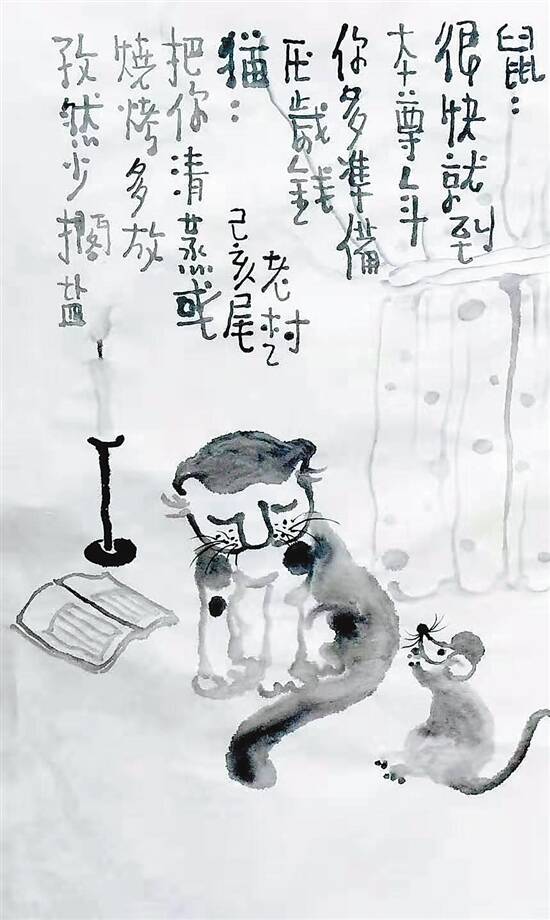 鼠:很快就到本尊年,你多准备压岁钱。猫:把你清蒸或烧烤,多放孜然少搁盐。 □老树