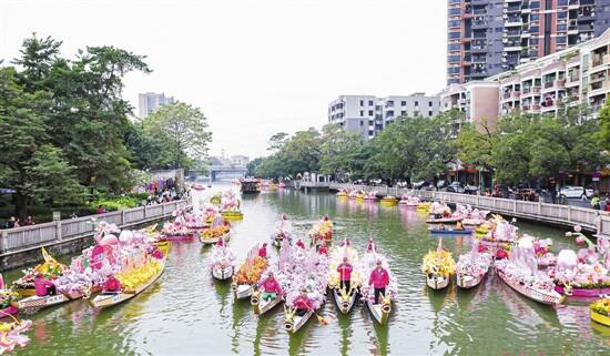 南海区里水镇第三届岭南新春水上花市14日白天已经吸引了不少市民 |