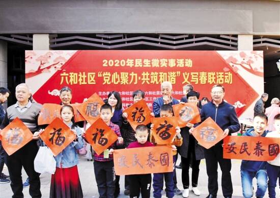 据悉,春节前夕,为营造浓郁的节日氛围,为广大社区干部及居民群众送上节日祝福,六和社区工作站通过2020年民生微实事项目平台,开展“党心聚力,共筑和谐”义写春联活动,组织5位书法家走上街头,从1月10日开始至12日,分别在山吓篮球场、万科花园、招商花园城开展3天3场义写春联活动,累计为群众免费现场书写春联900余副。 在活动现场,5位书法家现场挥毫写春联送街坊,书法家身边围满了前来领取春联的居民。领取到两副春联的张阿姨喜笑颜开,她说,现在的春联都是印刷品,没味道了,贴上这种手写春联,感觉年味都要浓一点,本来自己只领了一副,看到书法老师写得那么好,忍不住又领了一副。她高兴地说:“我们是外来务工人员,今年不回老家过年,六和社区还组织书法家为我们免费写春联,有种家的感觉。” (文/图 蔡鹏飞 刘颂平 汪冰荣)