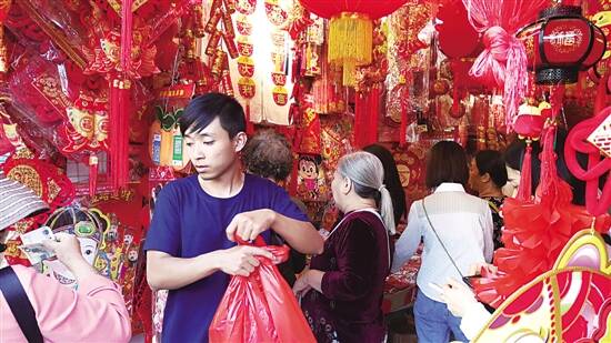 一德路是广州玩具批发集中地,羊城晚报记者近日在这一带走访的时候发现,大约有一半的临街商铺都改为经营对联、挥春、利是封等年货,而且生意很好,每家店都有三五个人在挑选商品。