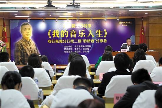 1月14日晚,农行东莞分行举办第二期“聆听者”分享会,国家级作曲艺术家、东莞市文化馆副馆长崔臻和主题分享《我的音乐人生》,来自人民银行、中国银行、税务局的青年朋友,与农行东莞分行员工代表齐聚一堂,共享艺术之旅,发现音乐之美。 崔馆长向大家讲述了自身热爱音乐、创作音乐的历程,现场分享了创作曲目《海峡之梦》《爱唱乌钦的阿爸》,带领大家畅游音乐殿堂。 特邀嘉宾女歌唱家齐亚男、李杜娟为大家倾情演唱《遇见对的人》《玛依拉变奏曲》《我们跟着你》等动人歌曲,优美动听的音乐使全场心旷神怡。 该行冯必凤行长作活动总结,对崔馆长的精彩分享致以感谢,介绍了与崔馆长相识的故事和自己与音乐的点滴,并表示东莞正是因为有崔馆长等优秀的音乐艺术家才是当之无愧的“音乐城市”,工作追求与音乐创作别无二致,要讲究“美感”“情感”“新鲜感”。从心出发,一切都会很美好。 农行东莞分行蔡兵副行长致辞,对“聆听者分享会”系列活动进行介绍,畅谈对音乐的三点体会,希望广大青年能借此机会走近音乐艺术、缓解工作压力、丰富精神世界。 该分行团委书记封晓庆通过“我们很幸福、我们遇见对的人、我们不辛苦”三句话寄语青年,希望青年热爱音乐,快乐工作,幸福生活。 大音希声,大象无形。音乐对心灵的滋养润物无声,用心感悟,您会发现更多美好。“聆听者”分享会将以更丰富多彩的形式,搭建交流平台,丰富精神世界。(周晓玲 杨文)