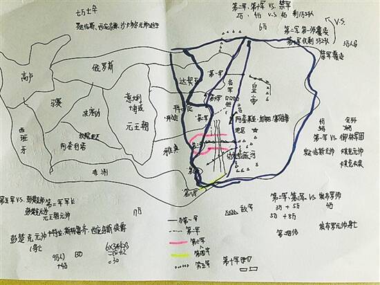 画地图是周炫桦自创的记忆和理解历史的一种方式,“让拿破仑的一众大将、元帅在欧洲各个战场叱咤风云,攻占维也纳的时候,心里也不由自主地高兴。学中玩,玩中学。”他时常将自己想象成历史事件中有影响的人物,例如拿破仑怎样攻破巴黎。