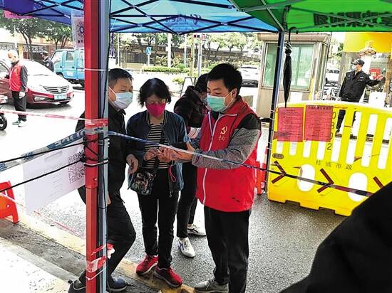 何祥浩(穿红马甲者)在社区卡点值守 |