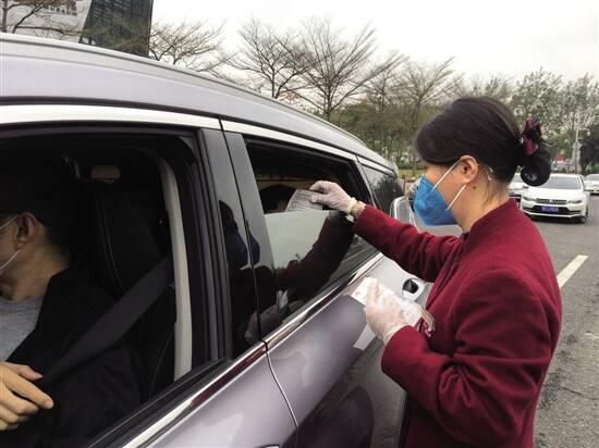 西樵山南门,工作人员对上山游客进行体温测量 |