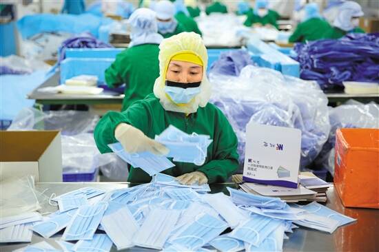 欣意医疗车间内,医用口罩、防护服等产品在有序地生产中 |