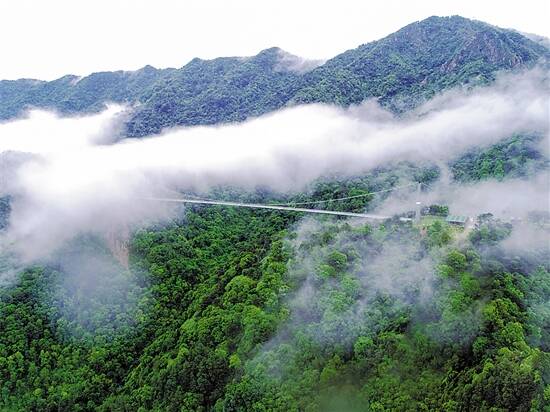 羊城晚报讯 记者张闻、通讯员张良玉摄影报道:空山新雨后, 几场潇潇的春雨过后,“佛山氧吧”南丹山烟雨蒙蒙,白雾衬着黛色山峦,甚至形成一座“云桥”,就是一幅活脱脱的中国传统水墨丹青。这一幕被景区工作人员拍下,堪称奇观。 雨水节气,润物细无声的春雨时常不期而至。被浓雾笼罩的南丹山山峰忽隐忽现,层层叠叠、隐隐约约,山之秀之奇完美地表达出来。飘动着的云雾如一层面纱在山峦中游曳,千变万化,甚至在南丹山玻璃桥的上方形成了一座几乎相同走向的“云桥”,两桥上下平行,尤为难见。 据南丹山景区工作人员表示,春雨洗礼南丹山之时是南丹山最美的季节,也是南丹山山花烂漫盛放的季节,木姜花、豆蔻花、杜鹃花都盛放了,还有很多不知名的山花。百花争艳中,南丹山的豆蔻花更是“一绝”。盛开的豆蔻,花瓣似美人蕉,粉黄,花心则为红色。豆蔻花不妖艳,朴实,纯洁,娇艳欲滴,是豆蔻年华最美的写照。