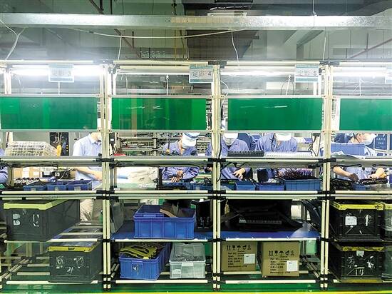 在珠海奔图电子有限公司的打印机生产车间,工人们在忙碌工作 |
