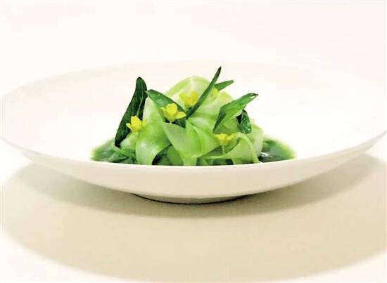 吃了这么多肉,想必有些腻了吧?那么就需要来点清甜鲜美的素菜来解腻。盐水菜心是广州一道家常菜。菜心品质柔嫩,富含营养;吃菜心还是原汁原味最好,加太多调料反而少了一份清新和鲜甜。现在就让跃·Yuè现代粤菜料理的总厨陈晓东想大家介绍其餐厅招牌菜跃式盐水菜心的炮制“秘诀”。