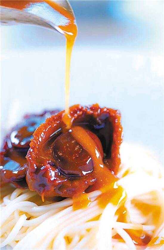 接下来出场的是鲍鱼。众所周知,鲍鱼肉质鲜美、富含营养,被誉为“餐桌黄金,海味之冠”。广州活泼·活海鲜烧烤的大厨,将其与富含维生素A的牛油搭配,教我们做其餐厅的招牌菜——牛油鲍鱼捞面。