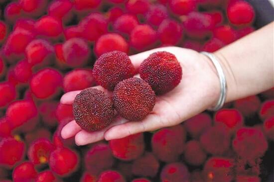 杨梅果实外表遍布柔软的刺突,有红、紫、白色品种,味偏酸甜。自古果中佳品莫过于荔枝,而杨梅也常在文人笔下与荔枝并称,明朝名臣徐阶咏杨梅诗:若使太真知此味,荔枝焉得到长安?据《本草纲目》记载,杨梅具有“生津、止渴、调五脏、涤肠胃、除烦愦恶气”功效。