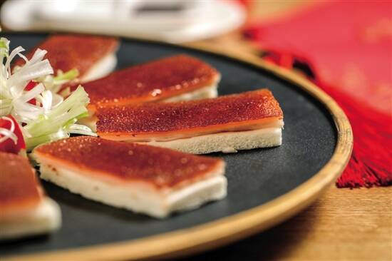 乳猪也是清明时节的主题菜品,广州花园酒店的乳猪选用广西优质乳猪,该猪种的猪皮比一般饲料猪更加厚实,因此烤制后口感更加松化,而且该猪种用红薯苗、黄豆、大米饲养,肉质口感更加嫩滑甘香。用秘制香料腌制与风干后,进行人工烤制,更能掌握金猪的火候,保留最传统的味道。