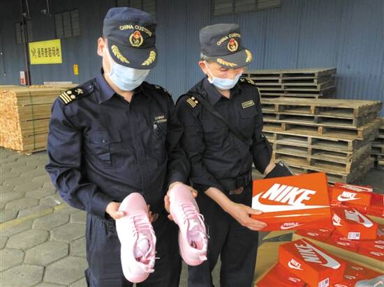 南海办工作人员查出申报货物中的假冒“耐克” |