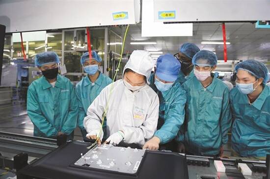 江门技师学院学员前往海信江门公司车间顶岗实习,正在进行培训 |