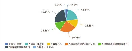 ◀◀◀ 排名前三的问题分别是眼睛疲劳等身体原因、没有跟老师和同学的互动和没有上课氛围,比例分别是52.54%、50.88%和43.44%。 |