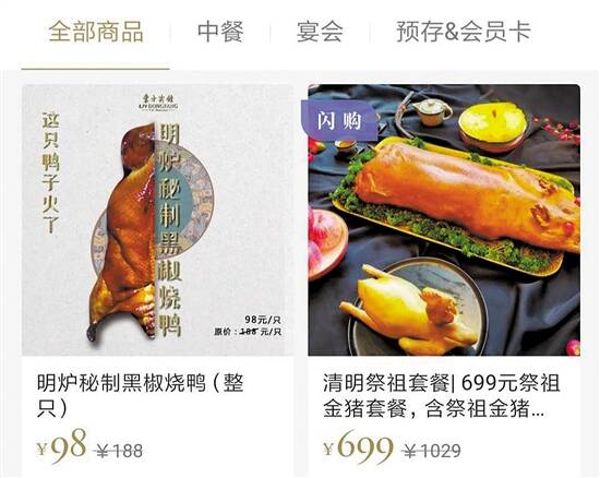其服务人员说,由于新冠疫情的关系,今年家族祭祖后聚餐的情况已不多,故酒店特意赠送代金券希望能带动消费。记者注意到,东方宾馆微商城中的烧鸭销量达510份,699元的祭祖金猪套餐销量则只有4份。