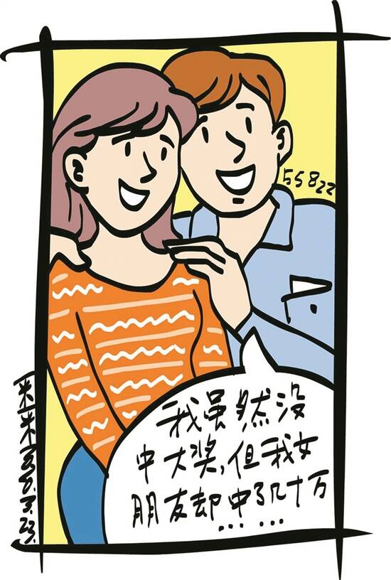 “需要我帮助你吗?我今天买了20元彩票,号码都写在纸上了。”丽花从口袋里掏出一张纸递给春生。春生说:“这些号码你都买过了,我就不重复啦。你看,我也在纸上写了不少号码。” 春生也从口袋里掏出一张纸,递到丽花手里。丽花接过,拉春生到一边坐下,与他共同研究那些号码。两人相聊甚欢,不觉就谈到了个人问题。春生问:“老同学,你有男朋友没?”“没。”丽花连连摇头。春生感到奇怪:“你如此漂亮,怎么会没男朋友?”“追我的不少,但没遇到合适的。”丽花说。 春生望着丽花:“你要找怎样的?”“我觉得你就不错,相貌英俊,年纪相当,而且也爱买彩票。”丽花低着头,脸色羞红。春生喜笑颜开:“是啊,我也是这种感觉。就是怕你不愿意,没敢直言。你把电话号码给我,以后方便联系。” 几天后,春生请三个姑娘在一家酒店吃大餐。三个姑娘走进包厢,发现迎接她们的除了春生,还有一个女的,“你们可能不知道,我虽然没中大奖,但是我女朋友却中了几十万元的二等奖,今天就是她做东呢”。 “啊!祝贺你女朋友中了大奖,恭喜你交了桃花运。”三个姑娘叽叽喳喳地打趣道,“接下来,我们就等着你们结婚摆酒的那顿大餐啦!” (陈大军)