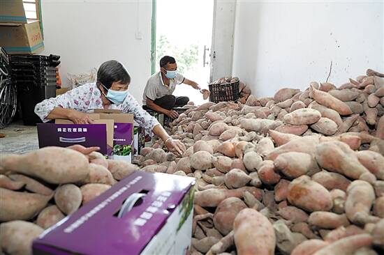 黄沙坑村是省定贫困村。近年来,该村在广州市花都区人社局对口帮扶下,盘活撂荒地,因地制宜发展消费扶贫,构建长效脱贫机制。全村53户112人贫困人口在2019年已全部脱贫。 “黄沙坑村属于偏远山村,16840亩山地,耕地面积却不到1000亩。但当地富硒土壤和纯净山泉水为橄榄、番薯、花生提供了独特的生长环境,绿色优质农产品在珠三角市场相当走俏。”花都区人社局驻黄沙坑村第一书记兼扶贫工作队队长谢加明告诉记者,在村民们的支持下,村里盘活撂荒农田,番薯、花生等经济作物轮作,将闲置资源转为村民增收资产。 今年,黄沙坑村农家番薯如期迎来丰收季,却让谢加明和村民们愁上心头。“今年番薯大丰收,整个仓库都不够放,门外还堆放了一些,但受疫情影响,剩下25000多斤的番薯都销不出去了。”建档立卡贫困户郑万龙叹息着说。“大部分物流停运,有订单也送不出,丰收了也烦恼。”谢加明说。 得知黄沙坑村扶贫番薯滞销,留隍镇镇村干部和村民们自发通过微信朋友圈、社交群帮忙宣传销售。“黄沙坑村番薯口感、品相和口碑都不错,我一发朋友圈,就有不少订单上门,很多还是回头客,周边的兄弟村也帮忙联系物流,借助电商平台进行销售,扶贫农产品触网走出深闺。”留隍镇扶贫办主任周爱瑜表示,他们采用镇内拼单,分时段定点自提的方式,线上下单,线下送货,帮助黄沙坑村缓解番薯滞销问题。周爱瑜也是这次网络销售滞销番薯的“带货王”,仅她一人就在网上帮忙卖出了100多箱。 “感谢乡亲们的相助,滞销的番薯就剩这最后一批货,赶紧打包了给顾客送去。”郑万龙说。近日,记者在丰顺县留隍镇黄沙坑村看到,一个个带着泥土芳香的农家番薯正被装箱打包。随着最后一批订单出货,困扰黄沙坑村扶贫工作队和村民的“甜蜜负担”将变成顾客舌尖上的美味。 “番薯销售一空,我心里的大石头也放下了。”谢加明说。三月春风和煦,阳光正好。在扶贫工作队的带动下,郑万龙和其他有劳动力贫困户一起对番薯地进行土地平整,播下花生种子。如今,漫步在黄沙坑村在田埂小径,花生地已开始展露新苗,长出新一年丰收的希望。