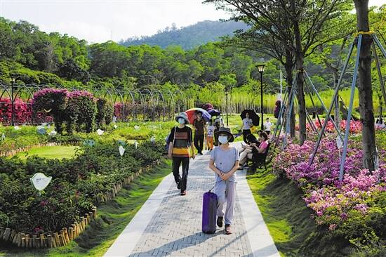 该公园今年3月初才恢复全面开放。目前,随着花开季节来临,游客逐渐增多。据悉,为迎接“五一”客流高峰,航城街道市政部门和簕杜鹃谷公园管理方全体工作人员提前制定详尽的处置预案,全力保障公园安全运行,为游客打造一个舒适又安全的休闲环境。“我们主要做的是扩充人手,一防疫情,二保安全。比如做好体温检测、提醒游客佩戴口罩、维护车辆及人员进出的现场秩序及流量、加大安保巡查力度等等。” 据了解,簕杜鹃谷公园是航城街道于2019年重点打造的首个超过1万平方米以上,集市民休闲、科普教育、文艺创作等为一体的综合性主题公园,位于凤凰山脚下的九围社区。园区内种植了118种不同品种的簕杜鹃花,架设了多条簕杜鹃长廊,最长一条约188米,是目前全市最长的一条簕杜鹃主题长廊。 另外,园区内有一座簕杜鹃科普馆,为岭南风格两层建筑,建筑面积1293平方米。馆内展示内容主要以深圳市花簕杜鹃为主题,集科普性、观赏性、趣味性为一体,是目前我国乃至世界首个以簕杜鹃为主题的科普馆。假期5天里,科普馆严格落实有关限流规定,控制进出速率及游客距离,接待游客总人数约8900人次。 (文/图 陈云强 刘会臣 周媛 李文)