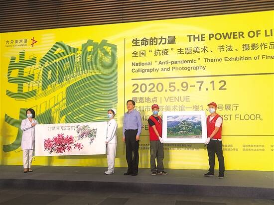 5月11日,“生命的力量——全国‘抗疫’主题美术、书法、摄影作品展”在大芬美术馆开幕。在实现了新冠肺炎疫情防控形势大逆转的时刻和国际护士节到来之际,开幕式上,12名医护人员代表获赠书法、摄影作品,深圳市第三人民医院也收到了抗疫美术作品。 优秀的文艺作品具有穿透人心的力量,在全国上下团结一心抗击疫情、攻坚克难之际,全市文艺工作者们将责任置于笔尖,用丹青礼赞逆行而上、冲锋在一线的战疫英雄模范,讴歌同舟共济的时代精神。在市委宣传部的领导下,市文联积极发挥组织优势、文艺优势,号召和组织广大文艺工作者创作优秀文艺作品,全市文艺工作者和爱好者积极响应,截止到5月,市文联共收到作品9000余件。同时,龙岗区委宣传部积极贯彻落实上级工作部署,第一时间组织发动全区相关部门及文化企业、文艺院团、文艺工作者和爱好者,开展抗疫主题文艺创作,共收到大芬艺术家投稿作品《全城戒备》《人体围墙》等美术、书法、摄影、音乐、文学作品2000余个,为打赢疫情防控阻击战贡献了龙岗文艺战线力量。 本次展览在梳理深圳本土艺术家作品同时,面向全国广泛征集原创作品。征集活动得到来自全国28省、自治区、直辖市艺术工作者的积极响应,累计收稿1006件(套)。展览集中展出精选投稿与特邀作品313件(套),涵盖油画、国画、版画、水彩、雕塑、摄影与书法等多个艺术门类。 (文/图 李薇 文姝琴)