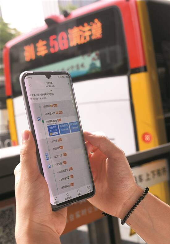图/羊城晚报记者 林桂炎 用手机就可以查询公交车的拥挤程度,繁琐的公交班次排班瞬间生成,一路上智能监测各种安全隐患并语音提示司机……这趟浑身科技感的公交车,13日起带着“全国首条5G快速公交智能调度试点线”的名义开进广州BRT公交通道,让乘客尝鲜。据悉,广州市交通部门安排BRT公交线路B27路,率先试点5G公交智能调度系统,并根据试点情况逐步推广到其他公交线应用。根据记者和乘客当天的搭乘体验,这条“5G公交线”真的很实用。 记者13日在BRT石牌桥站看到,工作人员正在引导乘客用手机扫二维码下载“广州交通·行讯通”APP,并建议乘客搭乘当天起插上5G翅膀的B27路公交车。最新版本的“广州交通·行讯通”APP中,多了带有5G标记的“BRT导乘”功能(见上图)。乘客点击进入该页面并搜索B27路公交线,会发现该趟公交线的页面和其他线路的不同——除了会告知下一趟公交车距离石牌桥站有多远,还会显示每一趟公交车的拥挤程度。 “能够增加这一功能,既和新设备有关,也和网络升级有关。”B27路线运营方,广州公交集团二汽公司信息中心副主任张志刚告诉记者,公司在每一辆B27线运营车辆的前门和后门,安装统计客流量探头,探头通过测算上下车人数得知该趟车的拥挤程度,上传服务器并传输到市民手中的APP,方便市民搭车。 记者搭乘一趟B27路公交车时还发现,但凡遇到其他车辆恶意切线、司机走神、车辆行驶中可能违章等情况,驾驶室内的广播系统会自动语音提示司机。“智能探测车辆安全的设备以前就有安装,不过现在更智能,可以实时语音告知司机行驶隐患。”张志刚说。 记者当天在广州交通信息指挥中心获悉,B27路有多个已升级的功能,依靠由广州市交通运输局基于5G网络建设的广州公共交通智能管理服务平台实现。依靠5G技术结合车辆智能设施提供的大数据,广州公共交通智能管理服务平台还可根据历史行车数据自动生成第二天公交班次表,并能根据突发大客流和路况智能调整排班。公交公司可根据智能排班合理安排配车数量,方便乘客搭乘。