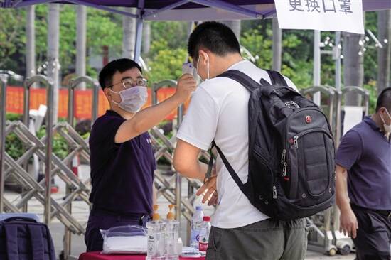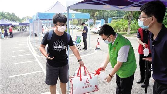 文/图 羊城晚报记者 余晓玲 通讯员 莞工宣 5月17日,东莞理工学院迎来2020春季学期首批返校学生。早上7时55分,该校教育学院(师范学院)16级音乐教育专业的马同学早早就来到松山湖校区东门前,准备进入校门。看着眼前熟悉的老师和校园,马同学直言很想念学校的一切。据悉,当日东莞理工学院首批返校813人,其中莞城校区94人,松山湖校区719人。返校首日,学校秩序井然,蓬勃朝气充满着整个校园。 欢迎学子归来 当日,学校领导分别到两校区检查指导学生返校工作。在学生报到点,校领导仔细了解了第一批学生返校概况以及为学生准备的防疫物资等情况;在学生食堂,校领导对食堂的消毒清洁工作、菜品供应情况和学生分时就餐安排提出相关要求;校领导还到学生宿舍了解同学们的生活、工作及学习情况,并欢迎学子归来。 记者注意到,在学校入校口,即松山湖校区东门、北门,莞城校区正门,每个校门均设置了学生返校专用通道,返校学生按照指引,经过更换口罩、测量体温、扫描粤康码提交信息以及行李消毒等程序后顺利进入校园。各二级学院组织教职工将返校学生送回宿舍。 学生进入宿舍区前,需要进行消毒、测量体温,并通过社区人脸识别系统检测才能进入宿舍。学校在宿舍区入口安装了多台体温测量器,出入社区都需要经过识别和体温测量,力保学生社区安全。遇到行李多的学生,社区管理员及社工还主动帮助学生提行李;在学生入社区前,社区管理员会仔细讲解体温测量器的操作方法,为学生提供细致的指导。 食堂则设置单向出入口,就餐人员需佩戴口罩,在入口处测量体温后才能进入食堂。就餐人员需按照指引购餐、就餐;食堂实时报告就餐座位数量,若食堂人员过于密集,食堂将启动限流措施。食堂丰富多样的套餐可满足学生的不同需求,学生能够自主选择、搭配。用餐时,返校学生需根据指引,到指定的就餐位进餐,两人桌坐一人,四人桌坐两人,错位而坐,保持安全距离。 回学校心安定 在返校的过程中,不仅有秩序井然的队伍,还有温情满满的服务措施。东莞理工学院特意在三个交通枢纽(东莞东火车站、虎门高铁站、万江汽车总站)安排专车集中将有需要的同学接回学校;学校还向每位返校学子派发了健康包,配备了定量口罩;在校内,有不少二级学院安排电瓶车、小三轮帮助同学将行李运送回宿舍。 返校首日,网络空间安全学院2016级软件工程专业的赖同学从长安的工作单位赶回学校,“回学校感觉很好,虽然还是有一些不方便,但是心安定了。因为我比较早就就业了,我也会和校长说的一样,与其他同学分享就业的经验,帮助其他同学。”