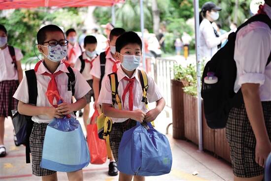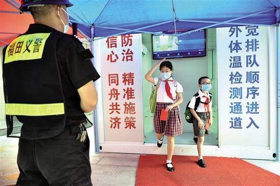 文/羊城晚报记者 沈婷婷 图/羊城晚报记者 王磊 校服穿好、口罩戴好、温水装好、绿码打印、书包背好……5月18日早晨,深圳各学校教职工守候在校门口,举着欢迎牌迎接第三批返校“萌娃”。据悉,此次返校的孩子包括全市340所小学1至3年级学生,共约58.7万名,孩子们结束“超长寒假”,第一天上学“犯迷糊”的不在少数,有人忘了同桌有人忘了座位,老师们花式迎娃也是让人倍感温暖。 “校服变小了,孩子长高了” 作为深圳第三批返校的学生,这群年纪尚小的“萌娃”备受社会关注。开学前夕,深圳不少老师通过各种方式表达了他们对这群萌娃的思念之情,当天更通过精心绘制的黑板报来迎接这群可爱的学生们。 “口罩后面依旧是我喜欢的小模样”,在南二外(集团)海德学校的黑板上,老师们这样写道,南山教科院同乐实验学校则是“春风十里不如教室有你”,华侨城小学是“写上所有人的名字,老师想念你”,海岸小学直接表白:“最好的等待是你们回来”。 “发现学生校服都变小了,孩子长高了,也长胖了。”对于孩子们的变化,南山区华侨城小学老师很感慨,一年级班主任颜老师还特意在教室门口给全班孩子拍了照片留作纪念。 除了老师,家长也为开学贡献自己的一份力。深圳市螺岭外国语实验学校的家长义工表示,自己六点就起床做准备工作,在公众平台进行宣传,还建群安抚家长情绪,家长义工一天分为4个班次,一个班次50名义工。 家长义工朱女士表示,自己是自愿加入学校义工队伍的,一是自己的孩子就在学校读书,另外,学生返校也想贡献一点自己绵薄之力。 开学第一天“萌娃”有点晕 开学第一天,找不到自己的班级、找不到自己的座位、找不到自己的同桌、找不到自己的寒假作业……低年级开学的小朋友们,开学第一天,还处在晕头转向中。 “你还记得自己是哪个班的吗?”“记得!我是三年级一班的。”为防止低年级学生们第一天入学“犯迷糊”,滨海小学组织了老师、家长义工、医护人员等在校门口指导学生们有序入学。 一位一年级的小朋友说,“假期过得很开心,但是我忘记自己坐在哪里了,怎么办。”记者发现,犯迷糊的小朋友并不在少数。家长郑女士告诉记者,这个超长假期,孩子很久没有回归课堂,都有点玩“野”了,“我们家孩子是前一天疯狂赶寒假作业,儿子告诉我,他已经不记得自己的同桌是谁了。” 三年级的韩同学乐呵呵告诉记者:“好多同学都吃胖了,脸都大了一圈,感觉有点陌生,不敢认了。”韩同学表示这个假期自己也长胖了10斤,“我们全家都长胖了,我还在长身体!” 调整讲课方式让孩子戴得住口罩 对于这些小朋友,午餐怎么解决呢?记者了解到,荔园教育集团各校区施行了课堂错峰休息制度,学校以楼层为单位,每个班按照规定时间分批休息,教室设置好提醒闹铃,错峰休息时间为5~10分钟,由任课老师组织孩子们拉开距离排队去洗手间,或在本班走廊范围内远眺、喝水,其他孩子则在教室做简易眼操。洗手台前,孩子们排着队,安静地站在一米线外有序等候,按照“七步洗手法”认真搓洗着双手。 特殊时期的校内午餐,师生们都时刻谨记保持安全距离。先洗手消毒,擦干净桌面,用小垫布铺在桌面,再排队从前门取餐,后门进教室,间隔就座用餐。用餐完毕,同学们立刻收拾好餐具并进行清洗。 为了督促孩子们保持足够的社交距离,避免聚集,深圳市蛇口育才教育集团育才二小(以下简称“育才二小”)老师们上完40分钟课后,课间10分钟则留在教室,继续与孩子们待在一起。 孩子能不能戴得住口罩?这是家长最关心的问题,育才二小一年级的做法是,组织同学通过小组讨论来强化戴口罩的道理,小组成员还能够互相提示戴好口罩,形成习惯。老师们也会根据学生戴口罩上课的实际,适当调整讲课方式,减少大声朗读、齐读和回答问题,代之以串讲、默读、笔写等方式,以减少戴口罩的不适度。