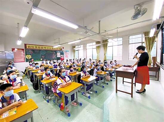 羊城晚报记者 陈卓栋 通讯员 李月清 谭耀广 5月18日,约16.3万江门市四到六年级小学生返校。17日起江门受到暴雨天气侵袭,幸好在18日早上学生返校期间,雨势暂缓,学生返校未受太大影响。 天公作美家长激动 18日早上7时左右,正值小学生返校高峰。一大早记者在路上看到不少家长带着小孩和大包小包的行李、书包一起返校。其中一位家长简小姐的儿子今年五年级,疫情期间一直在家上网课,家里的老人家得轮流看管,花了不少心思,简直是“心力交瘁”。今天熬到了返校,心情还挺激动,“很久没起早送他上学了,昨天晚上还特意调了闹钟早点起,怕耽误他上学。” 虽然昨天下午到晚上江门一直受到暴雨天气侵袭,但在18日早上学生返校期间,全市各地雨势均有所放缓。不少家长说,虽然路上交通较为拥堵,所幸没下雨,“今天还算是天公作美”。 进入课室必须戴口罩 根据新冠肺炎疫情防控要求,江门市教育局人士表示,返校后教育部门将继续压实属地管理责任,压实学校主体责任,细致入微查漏补缺,在严密落实疫情防控措施前提下稳步推进复学复课工作。记者看到,各小学在迎接返校学生时均做足了防控措施,包括测温、检查健康证明等。五邑大学第一附属小学负责人表示:“从早上7时30分开始,高年级的学生将最先返校,学校全体教师及义工和交警都会在校门口开展交通疏导工作,并确保学生间隔1.5米排队。”该负责人解释,学校实行各年级错峰返校,并在校门口安装水龙头,学生入校后必须洗手。 值得一提的是,江门各所小学学生进入课室内都佩戴口罩。江门市教育局副局长赵国松上周就在江门市疫情防控第四场新闻发布会建议,师生在教室、图书馆、宿舍、饭堂、小卖部等室内场所,与其他人近距离接触时戴上口罩,在返校和日常上下学乘坐公共交通工具时也要戴口罩。 将进行线上教育评估 此外,记者也了解到,鉴于目前江门市中小学已按照计划分批有序返校,为在疫情防控期间进一步减轻学生负担,落实教育教学中减轻学生负担的措施,保障学生健康成长,江门市教育局发布了《关于进一步减轻学生负担的通知》,提出加强课堂教学管理、科学合理布置作业、规范统一考试及评价、合理安排学生作息时间、加强学生体育锻炼、坚持德智体美劳五育并举、加强与家长联系和互动、加强生命主题教育、继续全面开展线上线下心理服务等9点意见。 记者了解,通知还提出了一些具体要求,如返校后利用四周左右的时间认真开展线上教育诊断评估,对学生线上学习情况进行摸底和诊断;返校后做好串讲复习,在确保每名学生较好掌握所学知识基础上,再进行新课程教学,切实做好教学衔接。