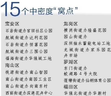 据介绍,在不合格的152个监测点中,低密度有132个,中密度有15个,高密度有5个。其中,高、中密度的20个“窝点”里,有8个在居民小区,其余多为公园、工地,还有1个是医院。中密度“窝点”说明有一定的登革热传播风险;高密度则意味着一旦有外部病例输入,就可能在周边片区引发登革热流行。 “深圳是全国最大的口岸城市,一天最多曾有100.5万人次出入境,登革热从外面输入的风险非常高。仅去年上半年,深圳就发现至少54例登革热,全部从境外感染输入。”深圳市疾控中心介绍,在深圳传播登革热病毒的“凶手”主要是伊蚊中的白纹伊蚊,俗称花斑蚊。它们最爱在水中产卵,过不了几天,大花蚊子就会从水里飞出来咬人。所以,最有效的办法是从源头上铲除这些蚊虫孳生的窝点。 深圳市疾控中心特别提醒,教育、住建、城管部门需要及时督促学校、工地、公园管理处,聘请专业人员消杀,彻底清理蚊媒孳生地。