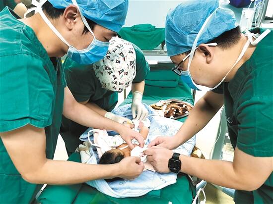 方剑(右一)为出生头颅受损伤的幼儿做麻醉 受访者供图 |