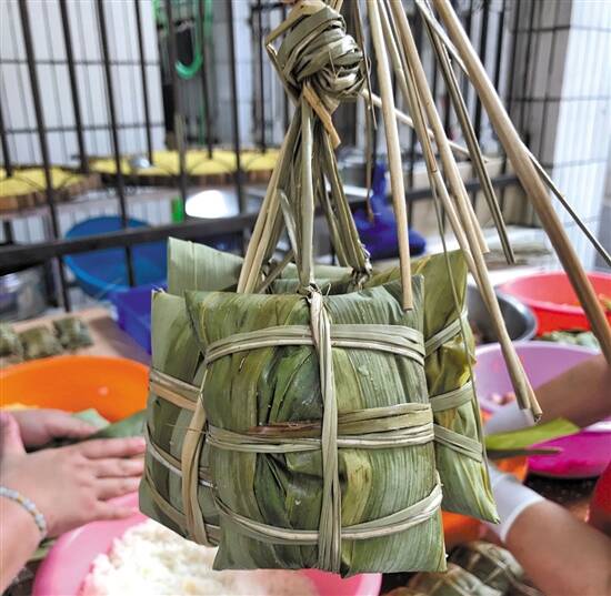 “彩姐波罗粽”的种类有很多,传统鲜肉粽的配料是糯米、绿豆加鲜肉,而陈玉彩就加入了咸蛋黄、花生、眉豆、腰豆等,吃起来口感更加丰富。“包的时候,为了把粽子包得更紧实,还要用牙咬住绳子的一端,很考手工和技术。” 彩姐告诉羊城晚报记者,她的粽子煮熟后就能切成片。