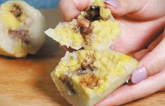 在潮汕地区,双烹粽很是出名,它之所以被称为“双烹”,就在于其馅料是由1/3的甜馅和2/3的咸馅组成,甜味咸味具备,口感丰富。