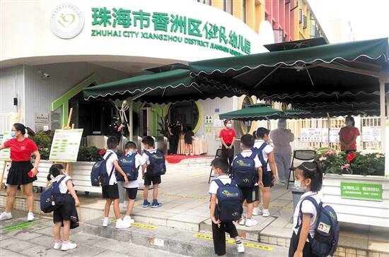 珠海市香洲区健民幼儿园,小朋友在排队入园 |