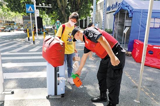 羊城晚报讯 记者沈婷婷摄影报道:6月10日至11日,哈工大(深圳)2000余名学生陆续重返校园,这是继5月11日、5月25日后,本学期迎来的又一批返校学子。 为了确保同学们顺利返校,学校做好了充分准备,在返校“第一关”——校门口,行李消毒、身份核验、体温检测等岗位的工作人员早早地就位,做好进入校门“三部曲”准备工作。 分批进入实验室、食堂“高考式用餐”……返校后的各项生活与学习都被安排得明明白白。为了保证食堂用餐秩序,学校行政部(处)、直属单位教职工全体“总动员”,从6月11日起,将在早餐、午餐、晚餐时间协助把好食堂“入口关”,全方位确保学生用餐秩序与安全。此外,同学们回校后,大部分课程依然采用“云端授课”形式进行。 在家里待了近5个月的同学们,回到学校能否适应?在返校现场,同学们用激动的小眼神告诉大家:没问题。 建筑学院2018级本科生王颖琳家在广州,10日就与爸爸妈妈一同抵达深圳。王妈妈表示,疫情期间,学校老师定期与家长通电话了解学生生活学习情况,返校前又确认了行程和到校时间,对学校的各项防控措施很放心。“我们全家人都很关注哈工大百年校庆,看到学校装扮得焕然一新,孩子说很想早点回来打个卡。”