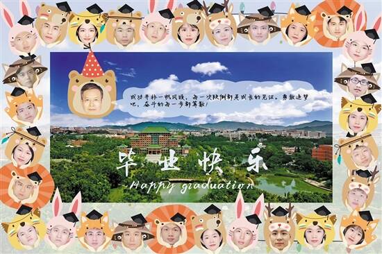 据悉,该学院考虑到一半的省外毕业生回校不容易,日前组建了毕业照设计团队,专门制作“云毕业照”。设计团队的安娜老师告诉记者,Q版毕业照选取了学校行政楼广场及湿地公园的俯瞰照,抠出干净的风景做背景,并为班主任、毕业生套上了不同卡通动物的头套;班级集体照则以学院标志性建筑温氏楼为背景,前面“排排坐”了一排卡通小猪、小鸡、小牛和蚕宝宝。