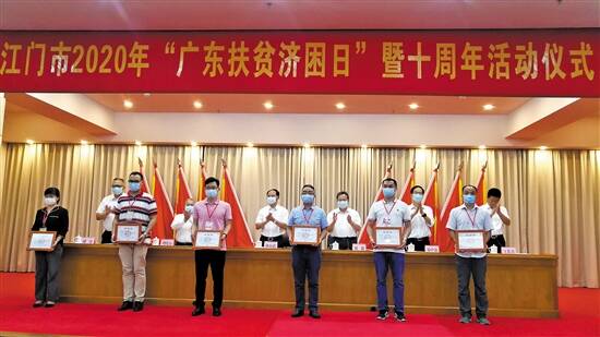 羊城晚报讯 记者陈卓栋,通讯员周颖森、谭耀广摄影报道:6月30日上午,江门市召开2020年“广东扶贫济困日”十周年活动仪式。会上对298个单位和个人授予江门市杜鹃花慈善捐赠特别贡献奖。据悉,自2010年首个“广东扶贫济困日”以来,10年内江门各级慈善会累计筹集慈善捐款超15亿元。 仪式上,江门市慈善活动总指挥部领导宣读了表彰2019年度“江门市杜鹃花慈善捐赠奖”认定情况。广东省豪爵慈善基金会等四个单位和个人获得特别贡献奖;陈国威基金有限公司、吴允尧获金奖;开平市在园恩荣文化促进会等13个单位和个人获得银奖;江门市红天工程发展有限公司等59个单位和个人获铜奖;另有220个单位和个人获得公益奖。 记者在仪式上获悉,10年来,江门各级慈善会累计筹集善款超15亿元,支持了助困、助学、助医、助残、助就业等一批脱贫攻坚和社会福利项目“开花结果”。 仪式上还举行了2020年扶贫济困慈善公益活动捐赠(认捐)仪式。江门市扶贫办相关负责人介绍,今年“广东扶贫济困日”活动设立了10类38个扶贫济困和慈善公益项目,“江门将积极动员社会各界参与募捐活动,资金重点用于江门脱贫攻坚和东西部扶贫协作。”